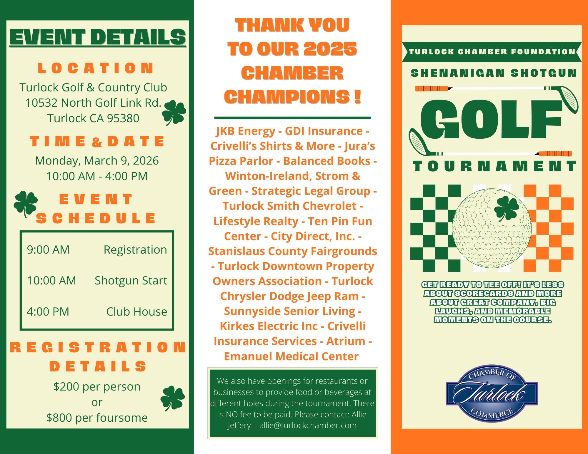 Get ready to tee off for a day of laughter, luck, and a little Irish-inspired mischief at the Shenanigan Shotgun Golf Tournament, hosted by the Turlock Chamber Foundation. This St. Patrick’s Day–themed event blends the spirit of friendly competition with the joy of giving back, all in support of education and community development efforts in Turlock and the surrounding area. Designed as a “fun play” tournament, Shenanigan Shotgun is less about perfect scorecards and more about great company, big laughs, and memorable moments on the course. Enjoy food and drinks inspired by the Irish love of whimsy, festive surprises, and a lighthearted atmosphere where everyone—from seasoned golfers to casual players—can join in the fun. It’s the perfect embodiment of work hard, play hard: come celebrate community, support a meaningful cause, and discover that doing good can be just as fun as it is impactful.