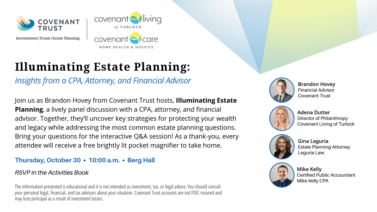 Join us as Brandon Hovey from Covenant Trust hosts, Illuminating Estate Planning, a lively panel discussion with a CPA, attorney, and financial advisor. Together, they’ll uncover key strategies for protecting your wealth and legacy while addressing the most common estate planning questions. Bring your questions for the interactive Q&A session! As a thank-you, every attendee will receive a free brightly lit pocket magnifier to take home.