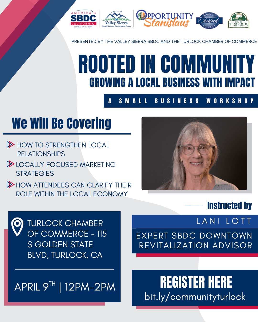 This small business workshop covers how to strengthen local relationships, locally focused marketing strategies, and how attendees can clarify their role within the local economy. Instructed by Lani Lott, a Downtown Revitalization Advisor for the Valley Sierra SBDC in partnership with the Turlock Chamber of Commerce and the City of Turlock.Images